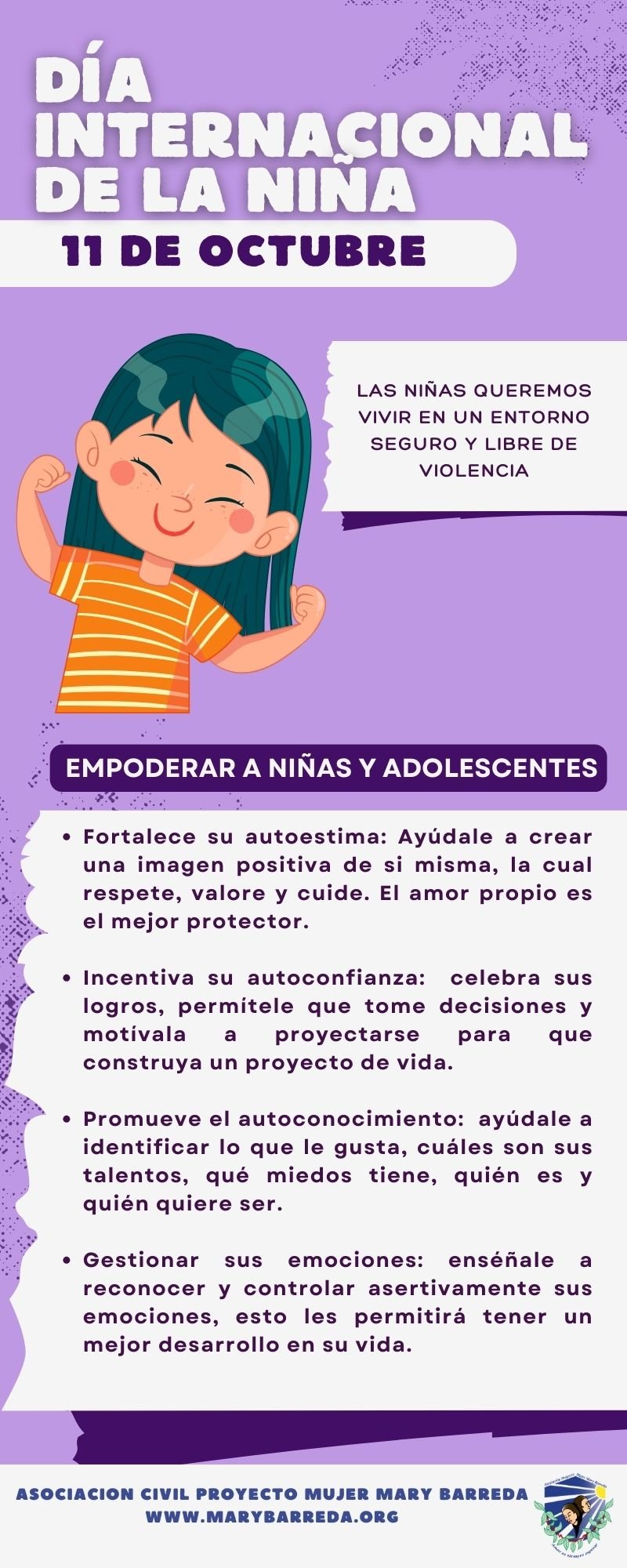 El Día Internacional de la Niña se celebra anualmente el 11 de octubre desde 2012, fue establecida oficialmente por la Asamblea General de las Naciones Unidas en 2011.