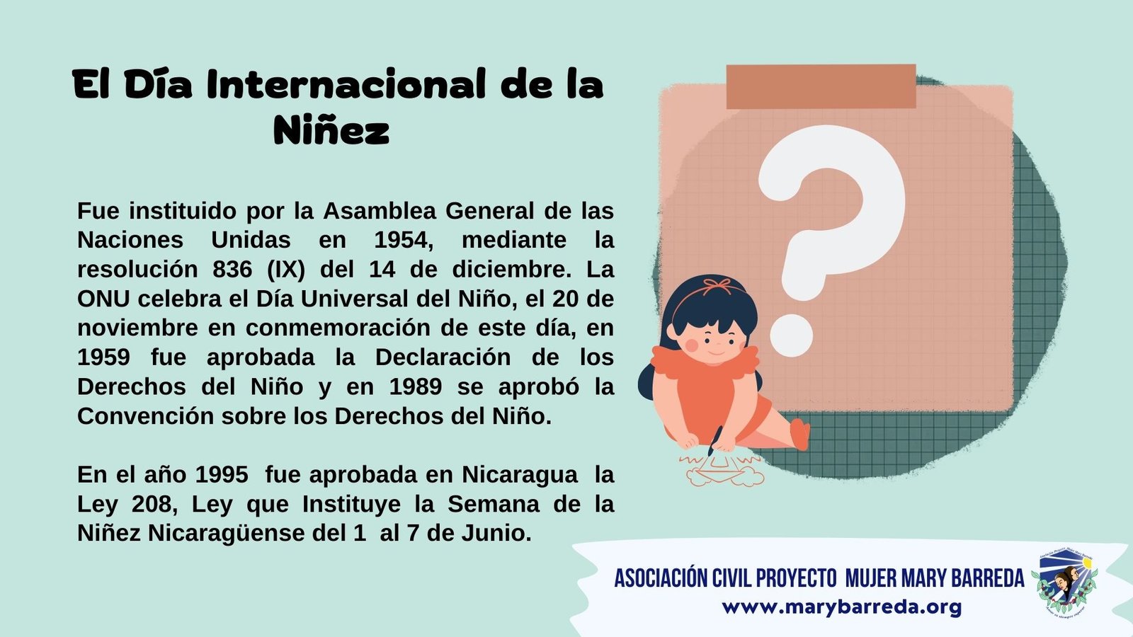 En Nicaragua fue instituida la semana de la Niñez y Adolescencia, según la Ley 208, Instituye la Semana de la Niñez Nicaragüense, aprobada el 27 de Noviembre de 1995.